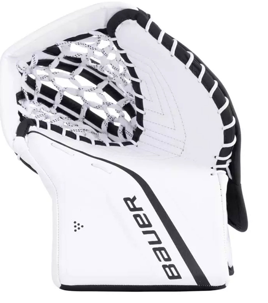 La mitaine de gardien de but Bauer Prodigy pour jeunes est disponible en blanc et noir, avec une version standard ou pour droitier, selon votre préférence.