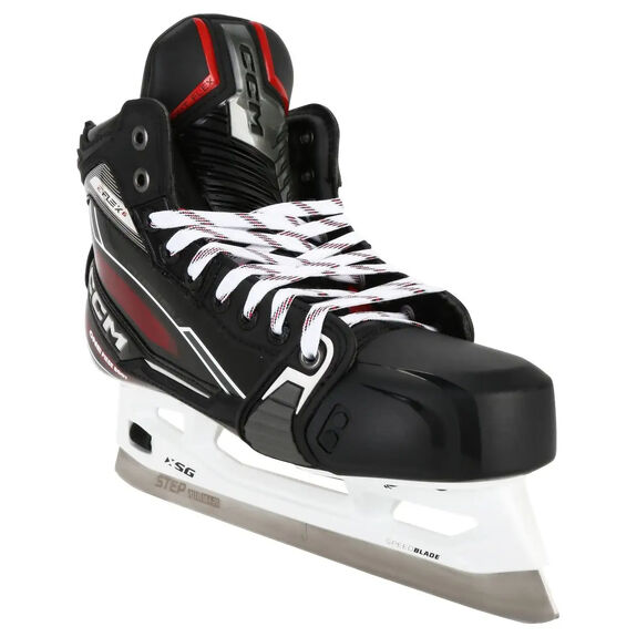 Ces patins utilisent le support Speedblade XSG à dégagement rapide de CCM avec système de verrouillage de la lame, associé à de nouvelles lames : les Step Steel 10F27. Il s'agit des lames haut de gamme actuellement disponibles chez CCM, spécialement dessinées pour favoriser une position de gardien de but inclinée vers l'avant.