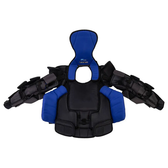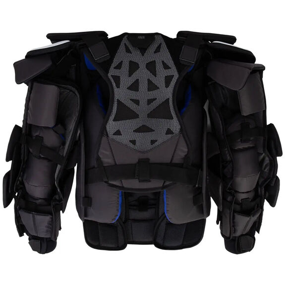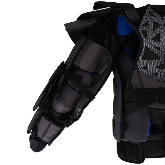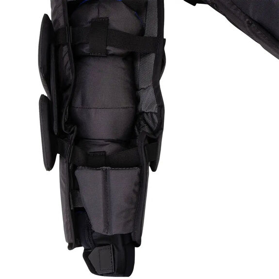 À l'intérieur des bras, un système de flexion dynamique à 3 points permet une rotation optimale et offre une liberté de mouvement totale au gardien lorsqu'il porte le plastron. Ce système est également renforcé par du CURV, un matériau durable qui offre une protection supplémentaire.