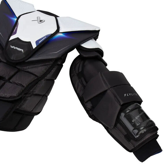 Les épaulières Flylite sont fabriquées en Shock-Lite Pro, offrant une protection et une absorption des chocs supérieures. Shocklite est conçu pour fournir une couche de protection légère et flexible contre les tirs et les rebonds. Le plastron et les bras Flylite sont également équipés de nouveaux flotteurs d'épaules pour un contrôle accru de la mobilité. Les protections flottantes sont discrètes et positionnées à distance des épaules, ce qui donne au gardien une allure imposante tout en réduisant l'impact direct des tirs.