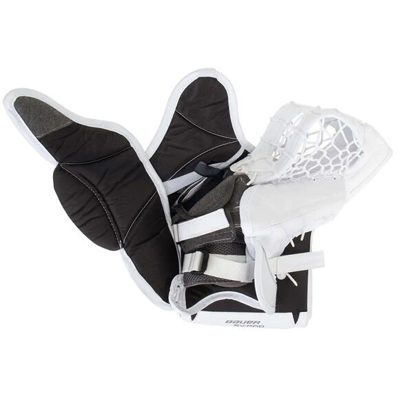 La mitaine de gardien senior Bauer SV-Pro est disponible en blanc, noir, blanc/noir, blanc/bleu, blanc/marine et blanc/rouge. Une version pour inversé est également disponible en noir et blanc.