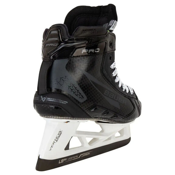 Les patins de gardien Bauer Pro conservent la combinaison support Vertexx et lame LS5G+, présente sur tous leurs patins de gardien haut de gamme ces dernières années. La lame LS5G+ des patins Pro bénéficie d'un nouveau profil d'agilité qui, comme son nom l'indique, favorise l'appui du gardien sur l'avant-pied.