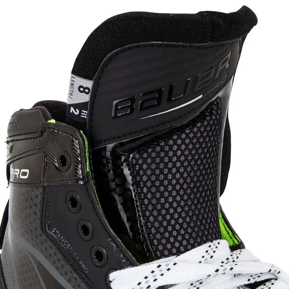 À l'instar de sa gamme pour joueurs, le nouveau patin Pro de Bauer est doté d'un système d'ajustement inédit, composé de différentes largeurs et profondeurs, conçu pour s'adapter à un plus grand nombre de gardiens. L'ajustement 2 (FIT2) correspond à un volume et une largeur moyens, très proche du profil Vapor actuel pour gardiens. L'ajustement 3 (FIT3) est un nouvel ajustement disponible des pointures 7 à 11,5 (pointures entières et demi-pointures) et 12 (pointure entière uniquement).