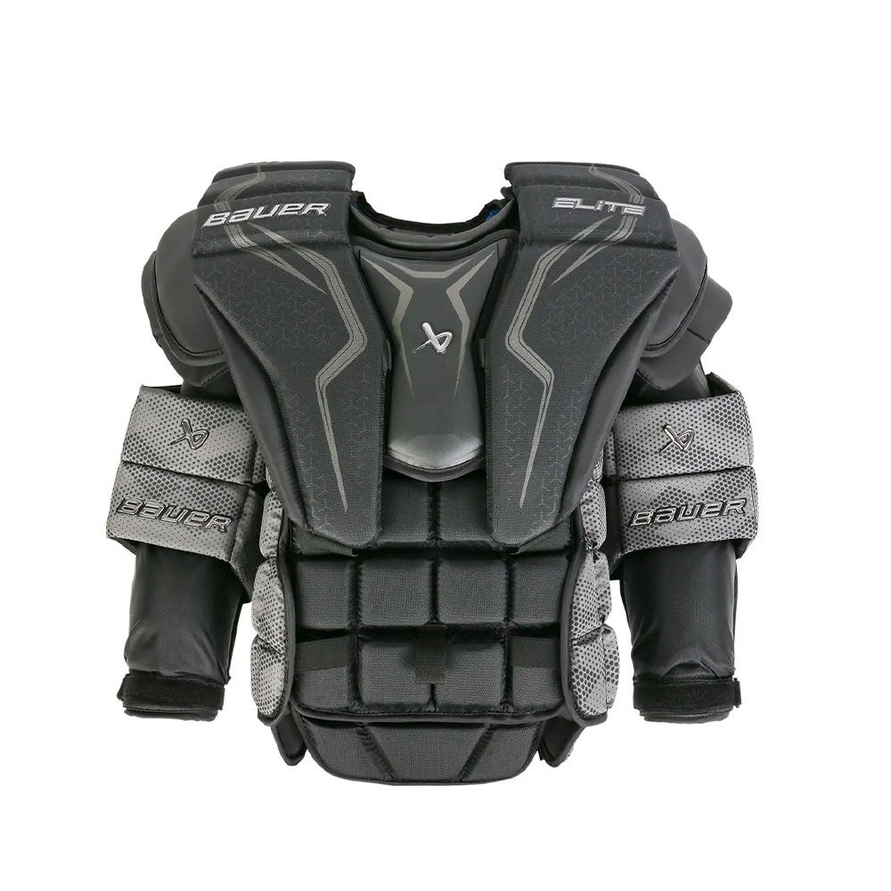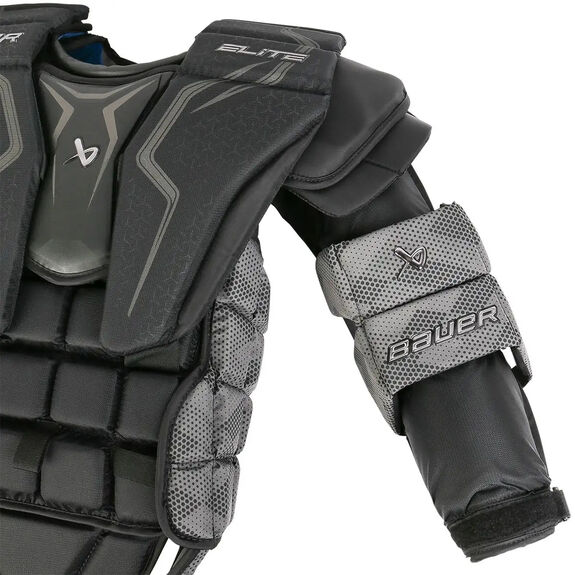La protection de poitrine et de bras Bauer Elite Senior est disponible des tailles S à XL, en noir comme illustré.
